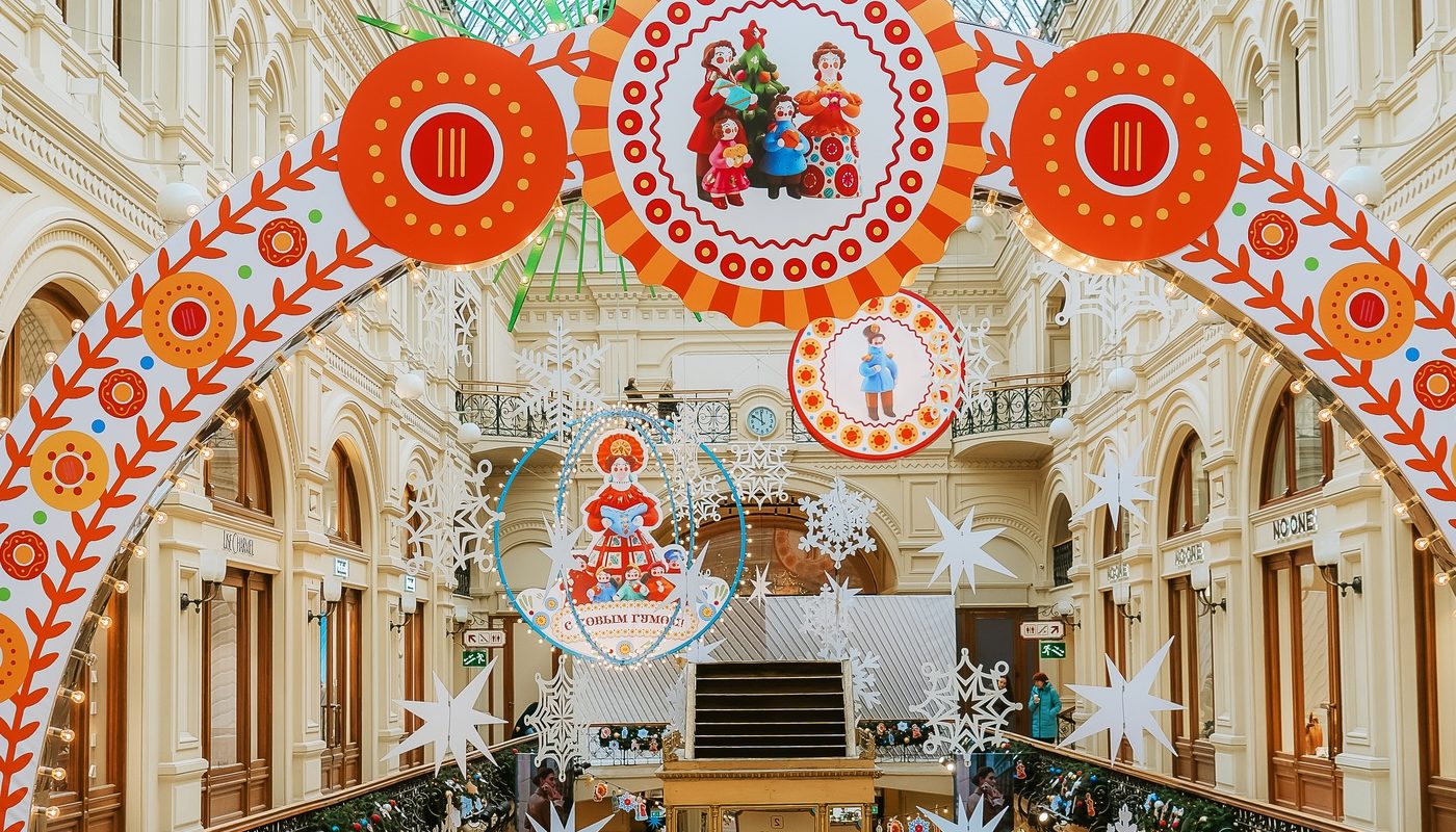 В 2025 году главной темой дизайна ГУМ-катка стала дымковская игрушка.